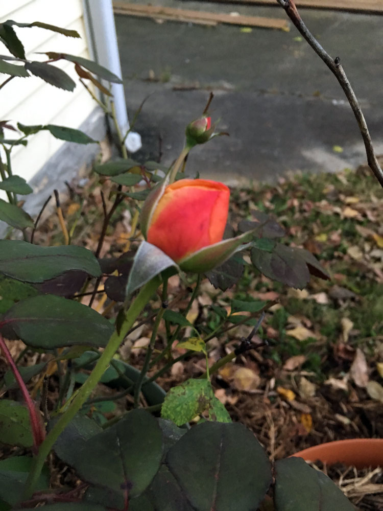 The other is Lady Emma Hamilton, who is apparently devoid of any sense of self-preservation. She put five buds out just before Halloween, when the temperature dropped into winter for us, and has been ever so slowly cracking them open. I cut the three most-open blossoms to take home for Thanksgiving, in case the frigidity a few nights ago was enough to convince her that it's time to pack it in for the year.
